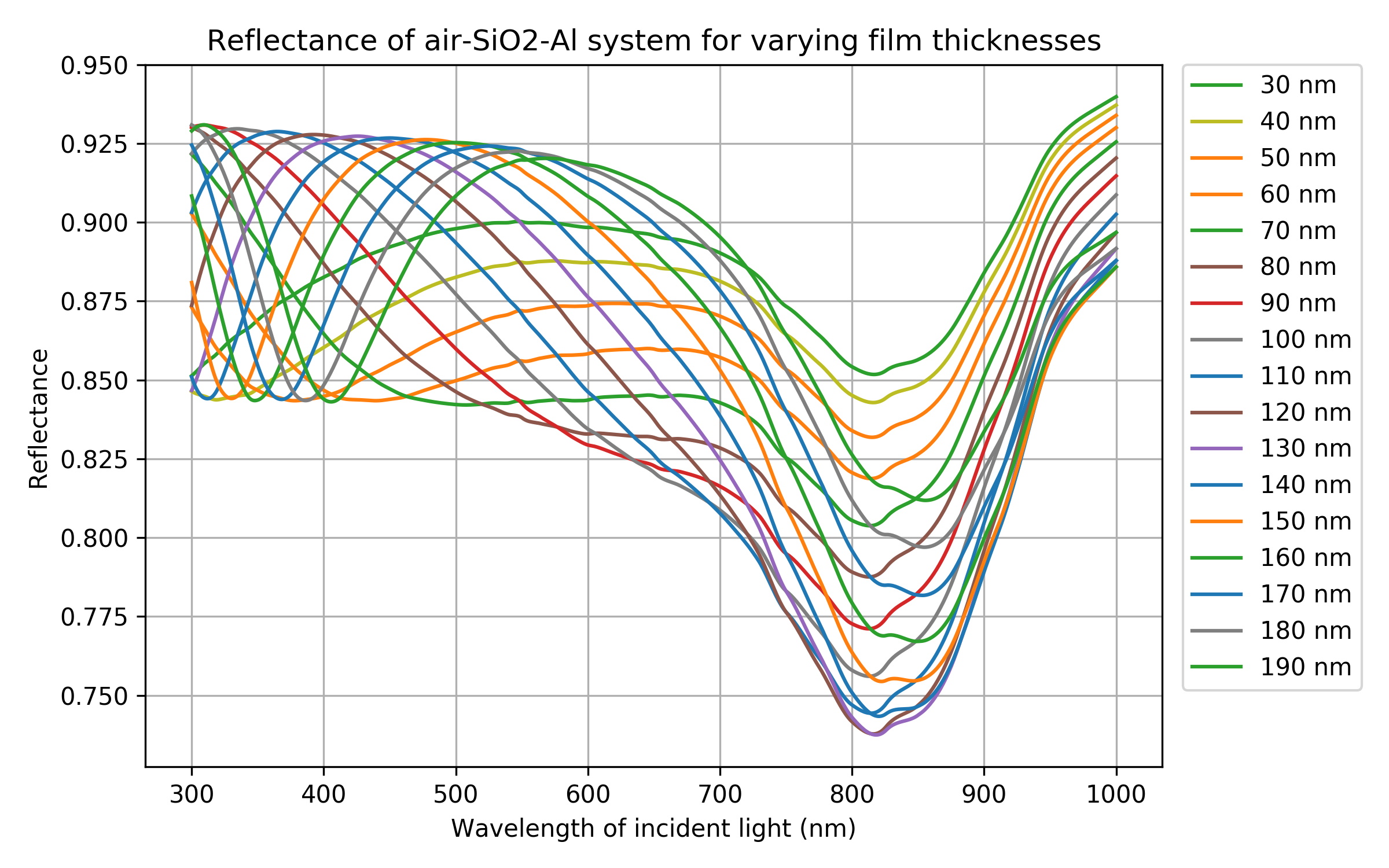A tool that interfaces with the OpenFilters application software to automate the generation of reflectance graphs for thin film simulation at many thicknesses, substrates, and optical filters. To assist with the development of structural colors for security applications at the Singapore University of Technology and Design.